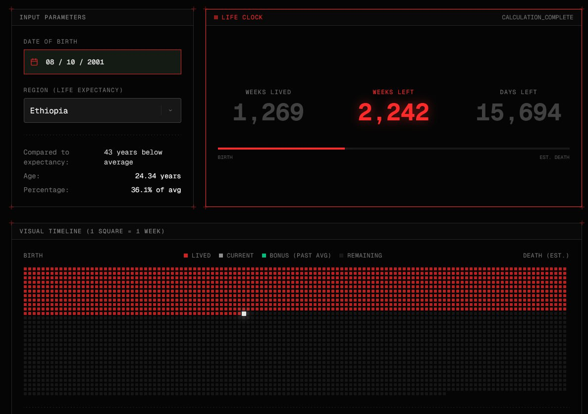 Memento Mori App: A thought-provoking website, āYou Think You Have Time Huh,ā built by Bilal Ali, calculates a userās remaining life in weeks based on their birth date. The concept, inspired by the Memento Mori philosophy, generated strong reactions and discussion about privacy and the existential nature of the project. 1, 2, 3, 4. Live Link