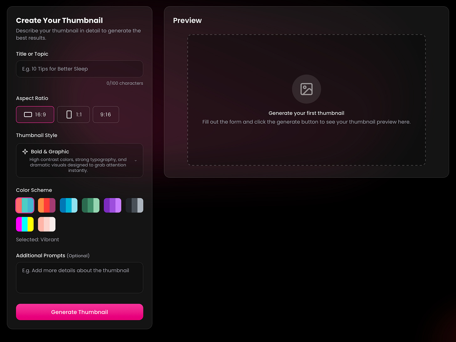 AI YouTube Thumbnail Generator: .࿐ deployed a full-stack AI YouTube Thumbnail Generator powered by Stable Diffusion. Users can choose styles, adjust colors, and save their creations to personal accounts. Built with React, Node.js, and MongoDB, the app integrates the Hugging Face API to provide creators with high-quality, AI-generated visuals for their video content. 1. Live Website