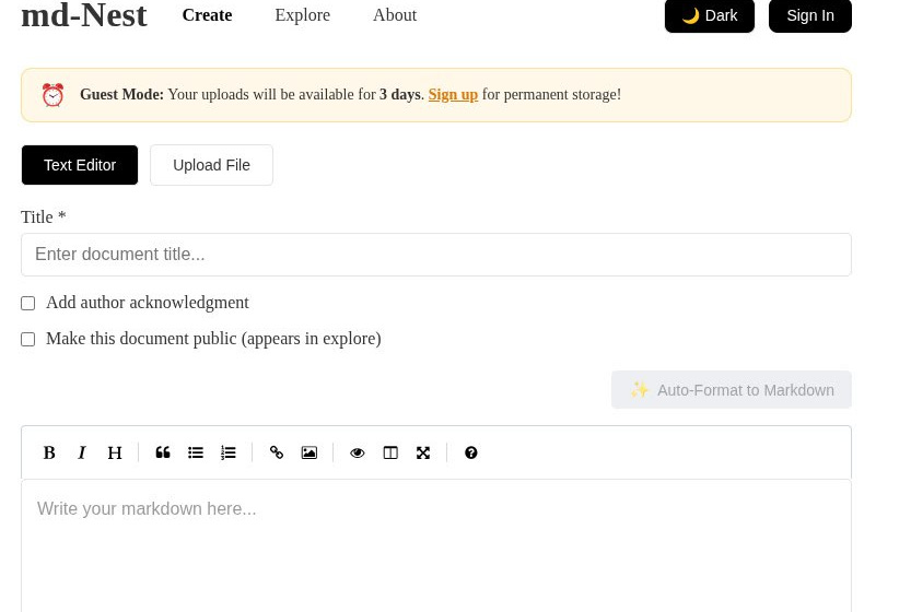 mdnest : An open-source platform for creating, editing, and sharing Markdown documents, developed by Yeabsira Endale.